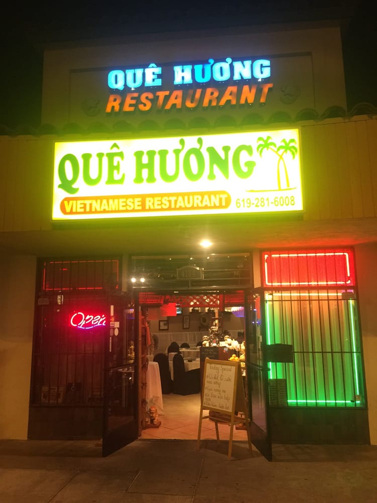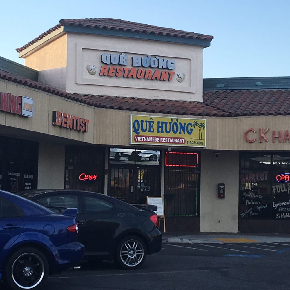 Que Huong's most popular dishs:Chicken wings in fish sauce or Tamarin sauce.Lemon marinated beef salad.Mango salad with shrimp and pork or with periwinkle.Chicken salad with shredded fresh banana flower.Wild boar meat stir-fried with lemongrass and chilly.We also have delicious beef noodle soup ( PHO ), rice plates, spring rolls, egg rolls......Our food choices vary from quail, frog legs, eel, deer, escargo, goat meat. Please come to experience the most exotic foods of our best authentic Vietnamese Restaurant in san diego voted by san diego magazine for 2011.Looking for late night Pho spot? Please! come to Us.We 're open untill midnight everyday.